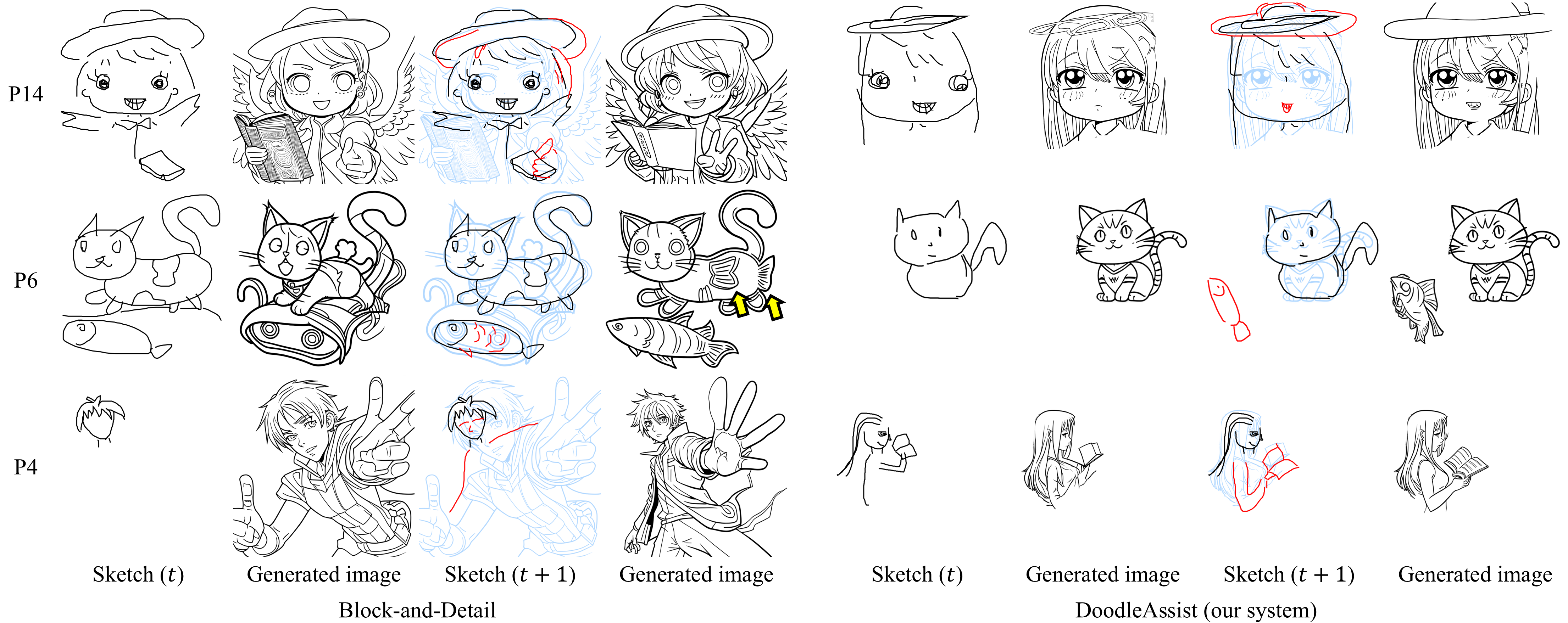 User study of iterative sketch to line art generation between Block-and-Detail system and ours. Newly added or modified strokes are highlighted